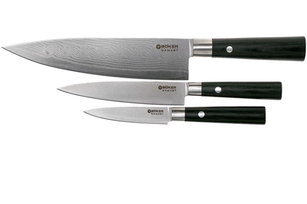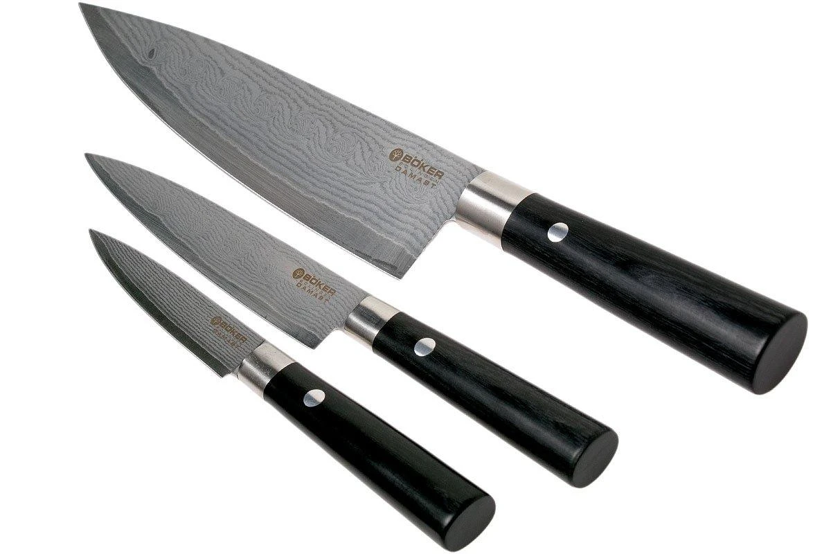 Ces couteaux de cuisine Böker Damast Black ont un manche traditionnel japonais en multiplex noir. Le design du manche avec les pinces en acier inoxydable mat apporte un aspect vraiment particulier. La couleur foncée du manche s’accorde parfaitement à la lame en acier damassé dont le noyau est en acier VG10 japonais. La lame a un tranchant incroyable pour une expérience culinaire à couper le souffle.