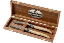 Ce set de couteaux Ă steak Fontenille Pataud est composĂ© de deux couteaux de table Laguiole avec manche en buis. Il sâagit dâune essence claire Ă la structure trĂšs agrĂ©able. Le buis nâest disponible que de petite taille et en petite quantitĂ©s, cela en fait une essence coĂ»teuse. On remarque sur le manche la âCroix du bergerâ traditionnelle qui le dĂ©core. Cette croix, formĂ©e par des rivets trouve son origine dans la tradition catholique. Elle permettait aux bergers de prier lorsquâils Ă©taient loin de leur village et donc dâune Ă©glise ou dâune chapelle. En enfonçant la lame dans le sol ou dans une miche de pain, ils positionnaient le couteau Ă la verticale, et la croix servait pour la priĂšre.