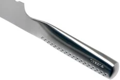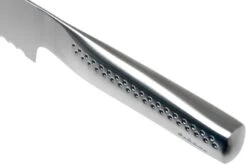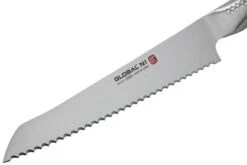Ce couteau à pain Global Ni GN-004 est le plus grand couteau à pain de la gamme Ni. Les dentelures de ce couteau à pain sont telles des dents de scie et permettent de couper à travers les croûtes de pain les plus dures et les plus épaisses. Ces dentelures préviennent le pain de s’écraser pendant la coupe. La pression de la lame est concentrée sur les extrémités des dentelures, les permettant de pénétrer facilement dans la croûte dure.