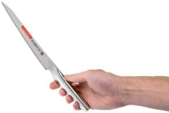 Le Global Ni GNM-12 est un couteau filet de la gamme Global Ni. La lame mince permet de lever des filets de poissons comme le bar ou la truite mais aussi les gros poissons comme le saumon. Si le couteau filet avec une lame de 18 cm semble trop grand, Global propose également une petite version Global GNS-06, 14,5 cm.