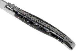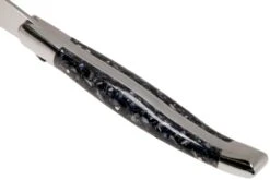 Ce couteau à huîtres Laguiole en Aubrac est un luxueux couteau bien particulier pour ouvrir facilement les huîtres et coquillages en toute sécurité, grâce à sa pointe non aiguisée. Le manche de ce modèle se compose de coquilles de moules broyées et de résine. Les éléments de coquilles plus foncées aux reflets bleutés et les petits morceaux de coquillages blancs scintillent et changent de couleur avec un reflet nacré à la lumière. Un superbe cadeau et un incontournable pour un festin avec des fruits de mer !