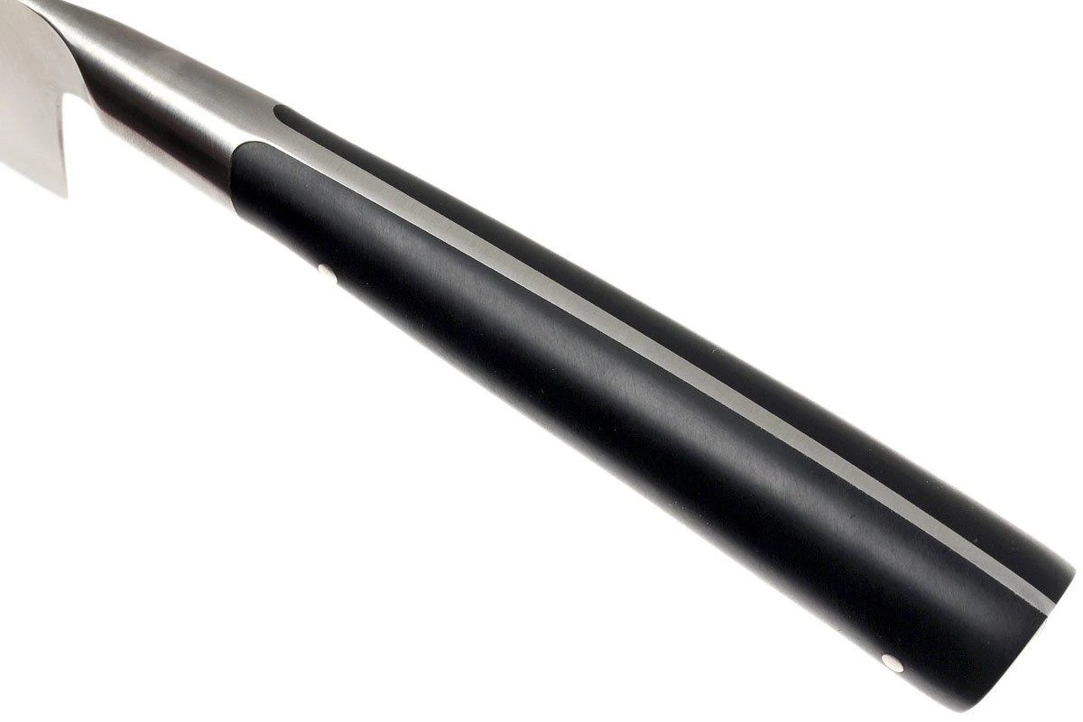 Le santoku Lion Sabatier Edonist noir est la version japonaise du couteau de chef. Sa lame est lĂ©gĂšrement plus courte et plus large que le couteau de chef europĂ©en. Santoku signifie âtrois qualitĂ©sâ en japonais. Pour certains ces qualitĂ©s seraient : couper, concasser et ramasser. Tout ce dont ce couteau est capable. Pour dâautres, il sâagirait de : viande, poisson et lĂ©gumes. Les trois ingrĂ©dients que le santoku coupe avec panache. Les alvĂ©oles de la lame empĂȘchent les ingrĂ©dients de coller Ă celle-ci. Un effet antiadhĂ©sif dont on profite particuliĂšrement lors de la coupe de tranches trĂšs fines. Le santoku nĂ©cessite une technique de coupe particuliĂšre. En effet, celui ne bascule pas sur la surface de coupe mais se dĂ©place en diagonale dans les aliments en partant du haut vers le bas. Lors de la coupe, le couteau est constamment Ă lâhorizontal.