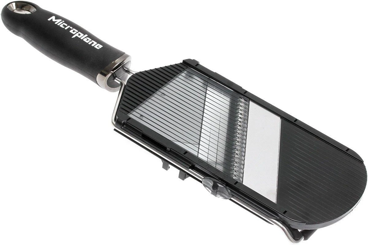 La mandoline Microplane Specialties reprĂ©sente une alternative compacte et avantageuse Ă un mandoline de grand format. Couper des tranches d’une Ă©paisseur de 1 Ă 3 mm est un jeu d’enfant avec cette mandoline. On ajuste l’épaisseur facilement avec le curseur sur le bord de la lame. Le couteau Ă julienne permet de trancher des bâtonnets de 3 mm de largeur. On règle l’Ă©paisseur des bâtonnets avec le mĂŞme curseur que pour l’Ă©paisseur des tranches.