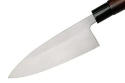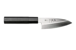 Le deba 16.5 cm Mujun S52-J est un couteau de cuisine japonais assez lourd. Le deba est, Ă l’origine, conçu pour rĂ©aliser des filets de viande et de poisson. La lame est plus Ă©paisse qu’un couteau de chef classique. On peut ainsi appliquer plus de force pour couper de petits os, des arĂȘtes ou des tendons, sans abimer le tranchant. Ce couteau n’est aiguisĂ© que d’un cĂŽtĂ©, l’autre cĂŽtĂ© ayant une Ă©mouture creuse. Cela Ă©vite que la viande ou le poisson y reste collĂ© pendant la coupe.