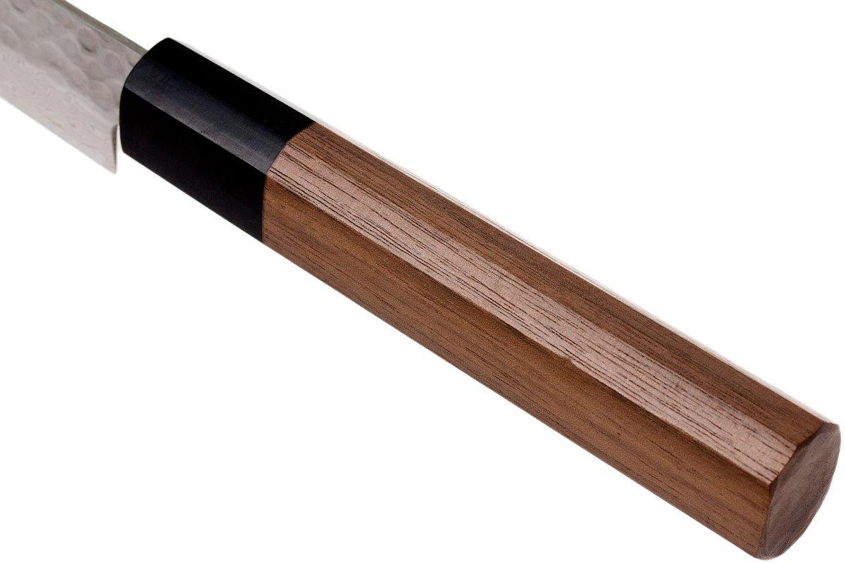 Le couteau d’office de la collection 45-Layer Damascus WA de Sakai Takayuki. Ce couteau, Ă©galement appelĂ© « petty », arbore une lame de 15 cm et s’avère super pratique pour les petites tâches de coupe.