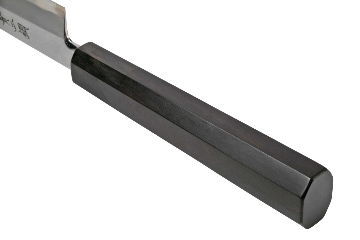 Le fuguhiki Sakai Takayuki Blue 2 Steel Japanese Style 01214 est un couteau de cuisine japonais, conçu Ă l’origine pour couper du fugu. Il s’agit d’un plat asiatique composĂ© de poisson-globe, trĂšs toxique. Les filets de ce poisson doivent ĂȘtre levĂ©s de façon extrĂȘmement prĂ©cise, afin de retirer les parties toxiques du poisson, sans contaminer le reste. Les chefs doivent suivre une formation spĂ©ciale avant d’avoir le droit de prĂ©parer ce plat. Et, bien entendu, ils doivent ĂȘtre Ă©quipĂ©s pour cela d’un fuguhiki trĂšs trĂšs fin !