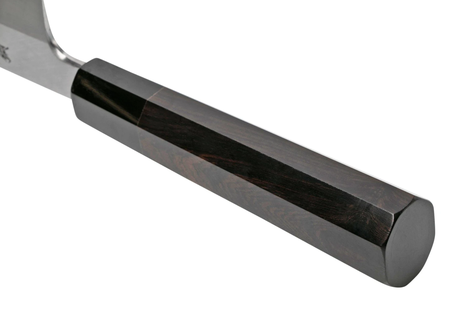 L’usuba Sakai Takayuki Blue 2 Steel Japanese Style 01263 est un couteau Ă lĂ©gumes japonais Ă©lĂ©gant. Il ressemble Ă un nakiri, sauf qu’il n’est aiguisĂ© que d’un cĂŽtĂ©. Son tranchant droit permet de couper des tranches trĂšs fines et rĂ©guliĂšres en un coup de main.