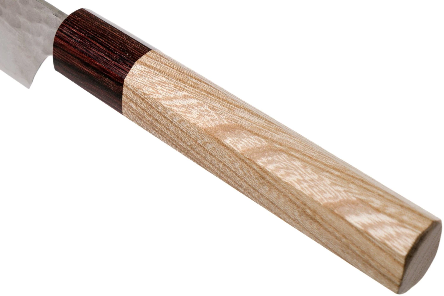 Ce couteau bunka Sakai Takayuki de la gamme 33-layer VG-10 Damascue Hammered WA a une lame kengata. Ce mot signifie  »lourdement rĂ©flĂ©chi » et fait rĂ©fĂ©rence Ă la forme de la lame qui s’incline brusquement Ă son extrĂ©mitĂ©. Ce couteau peur ĂŞtre considĂ©rĂ© comme un membre de la famille des santoku. Grâce Ă sa pointe Ă©troite vous pouvez couper la viande, le poisson et les lĂ©gumes très finement.