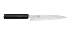 Le yanagiba Sakai Takayuki VG-10 Honyaki Shoryu 00201 est un couteau de cuisine aiguisĂ© d’un seul cĂŽtĂ©, avec des propriĂ©tĂ©s de coupe incroyables. La lame de 27 cm de long permet d’effectuer de longs mouvements de coupe. Pour des tranches rĂ©guliĂšres. De quoi prĂ©parer des tranches ultra fines de viande, poisson ou lĂ©gumes. C’est idĂ©al pour les sushis ou les sashimis ! La lame a Ă©tĂ© fabriquĂ©e selon la mĂ©thode Honyaki. Il s’agit d’une des plus anciennes mĂ©thodes japonaises. Les couteaux Honyaki sont faits d’une seule piĂšce d’acier carbone haut de gamme, et sont forgĂ©s Ă la main. Le temps, l’Ă©nergie et les matĂ©riaux utilisĂ©s font que ces couteaux Honyaki sont trĂšs chers. Sur le cĂŽtĂ© de la lame, on trouve l’inscription «  »Shoryu » », qui signifie dragon volant. Ce couteau est livrĂ© avec son Ă©tui Saya. Le Saya est un fourreau traditionnel qui vous permet de ranger votre couteau en toute sĂ©curitĂ©.