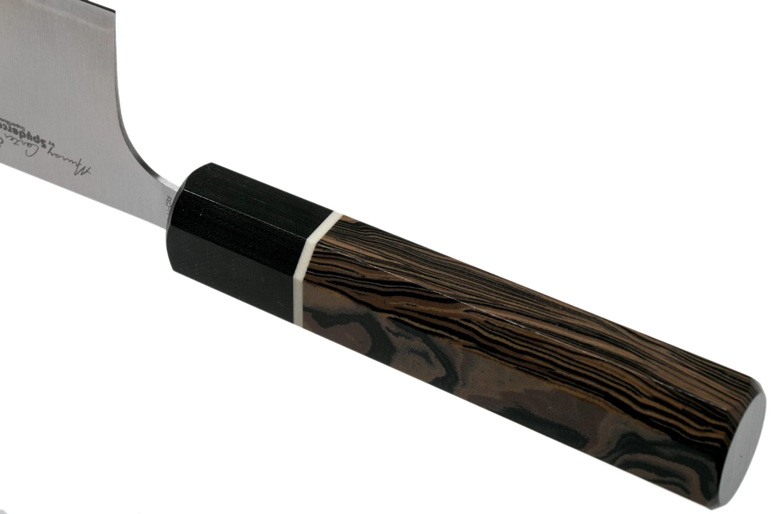 Le Spyderco Nakiri de la gamme Murray Carter Collection est tout simplement superbe. Nakiri signifie en japonais : âcouteau pour couper le vertâ. Sa forme rectangulaire caractĂ©ristique le rend idĂ©al pour la coupe prĂ©cise de toutes sortes de lĂ©gumes. La pointe du couteau est lĂ©gĂšrement arrondie afin de couper les lĂ©gumes rapidement. Couper les herbes finement ne lui pose aucun problĂšme.