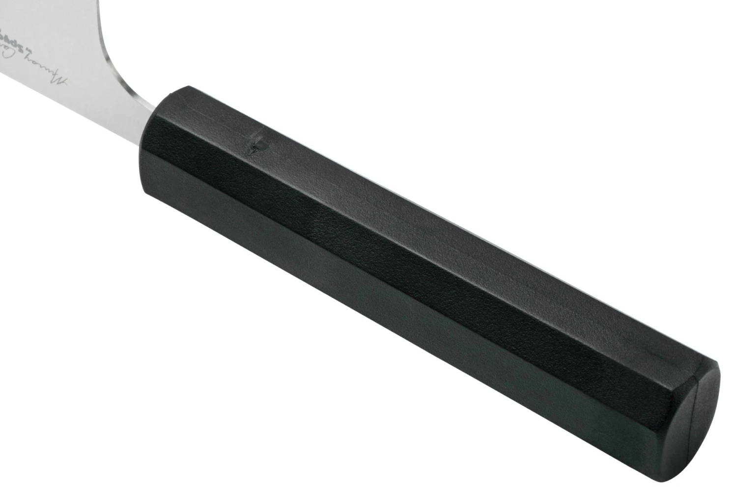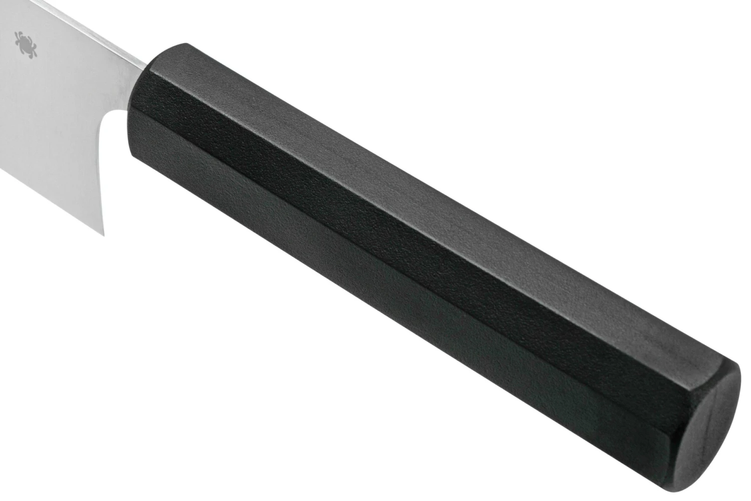 Le couteau Nakiri Spyderco de la collection Murray Carter Minarai brille par sa simplicité. Nakiri signifie « trancheur de légumes ». Sa forme rectangulaire caractéristique le rend idéal pour la coupe précise de toutes sortes de légumes. La pointe du couteau est légÚrement arrondie afin de couper les légumes rapidement. Couper les herbes finement ne lui pose aucun problÚme.
