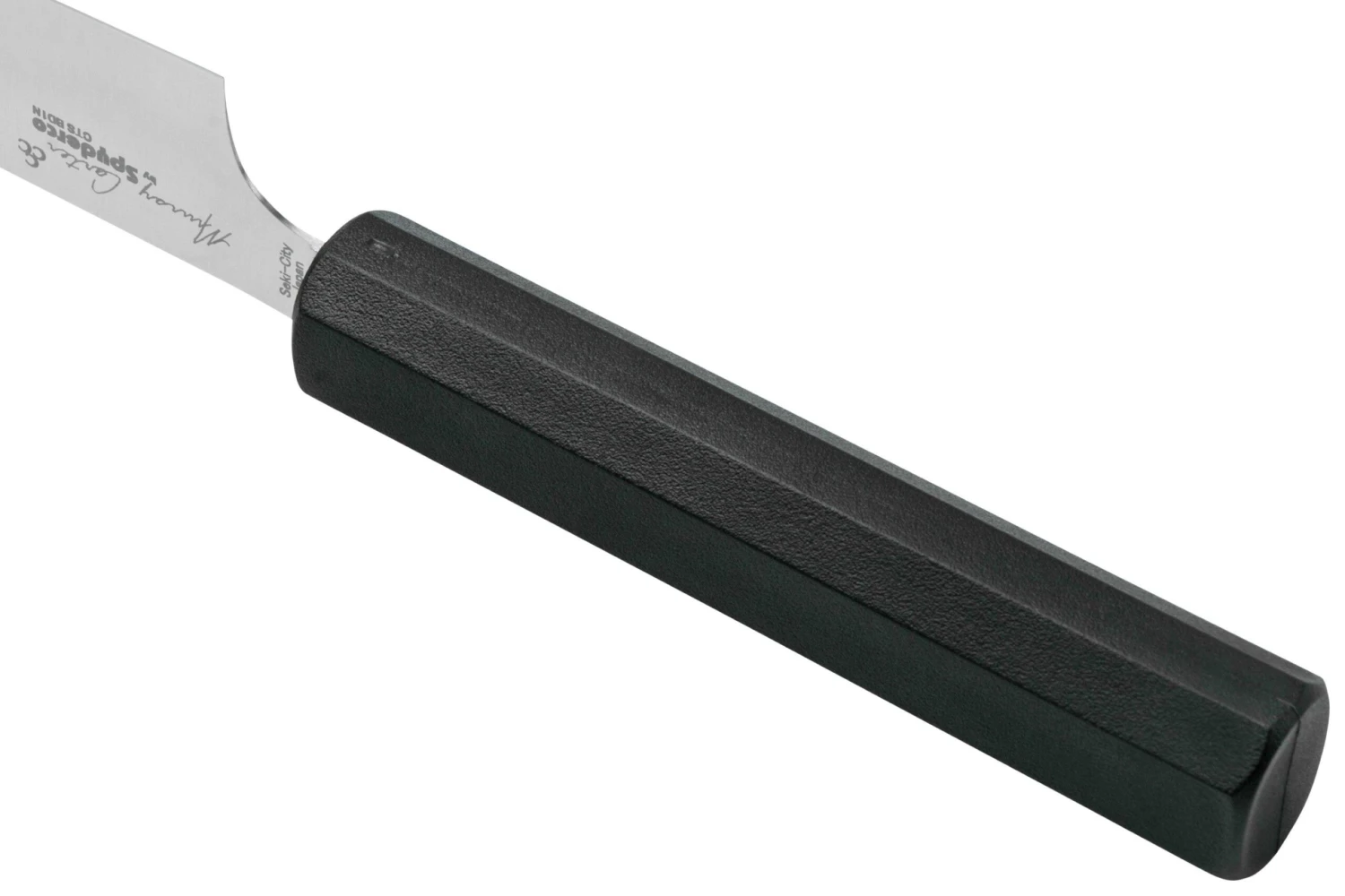 Le Spyderco Minarai Petty de la collection Murray Carter est le plus petit couteau de cuisine de cette gamme. Ce couteau Petty (du français « petit ») est l’équivalent du couteau à éplucher. Idéal pour éplucher et couper les fruits et légumes mais aussi pour préparer des garnitures détaillées permettant de décorer les plats.