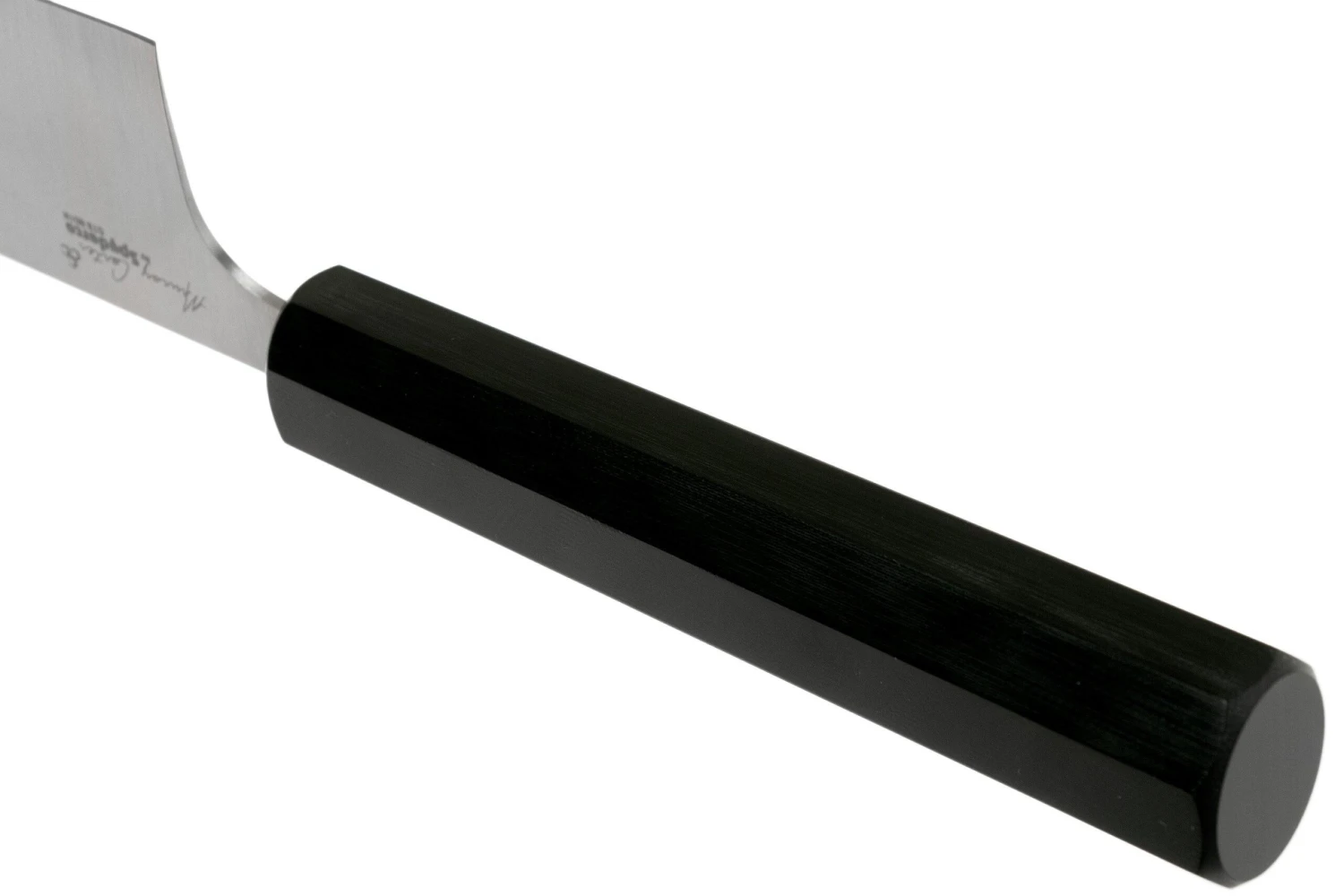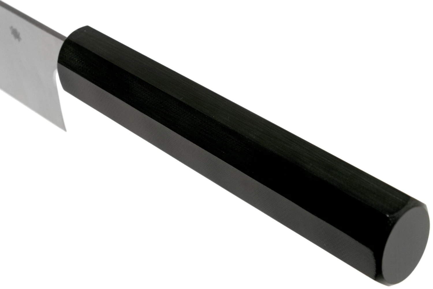 Le couteau Spyderco Wakiita Gyuto de la collection Murray Carter est le couteau le plus polyvalent de cette gamme. LittĂ©ralement traduit, Gyuto signifie ‘couteau Ă bĆuf’. Le Gyuto est l’Ă©quivalent japonais du couteau de chef occidental. Un design polyvalent qui convient parfaitement pour couper la viande, le poisson, les lĂ©gumes et les herbes.