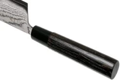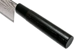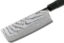 Le nakiri Tojiro Shippu Black damascus 16 cm est un couteau à légume traditionnel japonais. On le reconnait par sa forme mince et rectangulaire avec la pointe du tranchant arrondie. Il est parfait pour couper des laniÚres de légumes. Sa lame trÚs fine ne convient pas pour hacher.